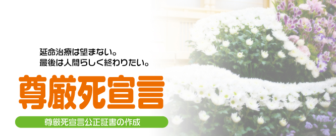 弊所では「尊厳死宣言」をより確実なモノにする為に「公正証書」という公文書として宣言を残すお手伝いをさせて頂いております。文案の作成から事前の公証人役場との打合せまで、全てをサポートいたします。