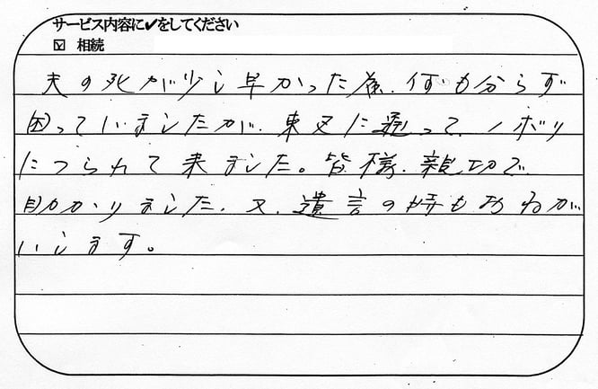 夫の死が少し早かった為、何も分らず困っていましたが、東区(役所)に通ってノボリにつられて来ました。皆様親切で助かりました。又、遺言の時もおねがいします。