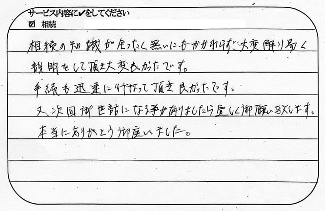 相続の知識が全ったく無いにもかかわらず、大変解り易く説明をして頂きたい変良かったです。手続きも迅速に行なって頂き良かったです。又、次回御世話になる事が有りましたら宜しく御願い致します。本当にありがとうございました。