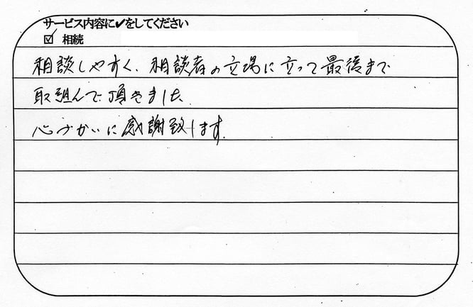 相談しやすく、相談者の立場に立って最後まで取組んで頂きました。こころづかいに感謝致します。